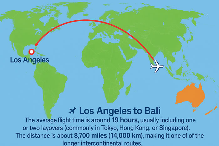 βοΈ Los Angeles to Bali β The average flight time is around 19 hours, usually including one or two layovers (commonly in Tokyo, Hong Kong, or Singapore). The distance is about 8,700 miles (14,000 km), making it one of the longer intercontinental routes.